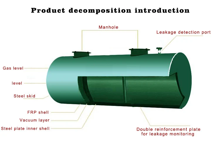 1. It consists of steel inner tank and reinforced glass fiber outer tank. The storage tank has a uniform interlayer space and is equipped with a leak detector.